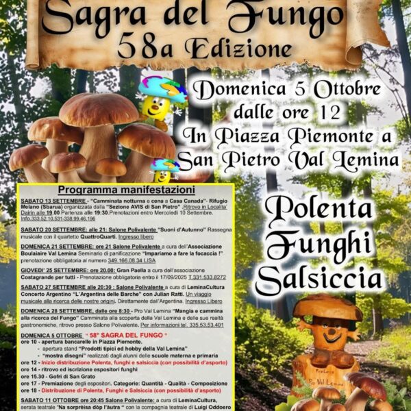 La 58ª edizione della Sagra del Fungo di San Pietro Val Lemina offre un programma ricco di eventi, tra cui il tradizionale mercato del fungo porcino, degustazioni di piatti tipici come polenta con funghi e salsiccia, e attività per bambini. La manifestazione è organizzata dalla Pro Loco, dal Comune e dalle Associazioni locali, con l’obiettivo di valorizzare il fungo porcino, simbolo gastronomico della Val Lemina.