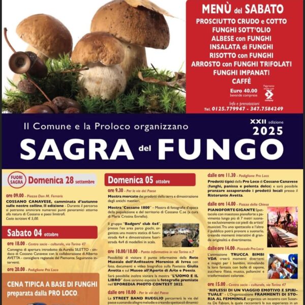 La XXII edizione della Sagra del Fungo di Cossano Canavese propone un programma ricco di eventi gastronomici e culturali. I visitatori potranno gustare piatti tipici a base di funghi porcini e partecipare a mercati, esposizioni e laboratori didattici. La manifestazione valorizza anche il territorio e le tradizioni locali.