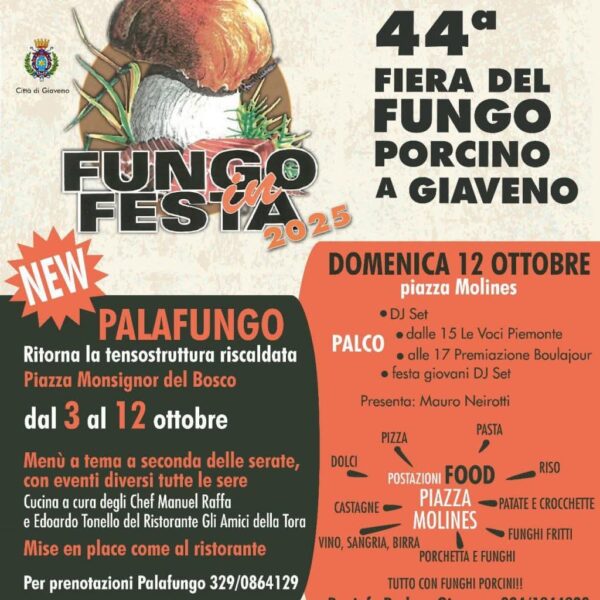 La Fiera del Fungo Porcino di Giaveno giunge alla sua 44ª edizione e rappresenta un punto di riferimento per tutti gli amanti del fungo. L’evento propone degustazioni, mostre mercato, showcooking e laboratori. La fiera valorizza il fungo porcino locale e permette ai visitatori di vivere un’esperienza completa tra gastronomia e tradizione.