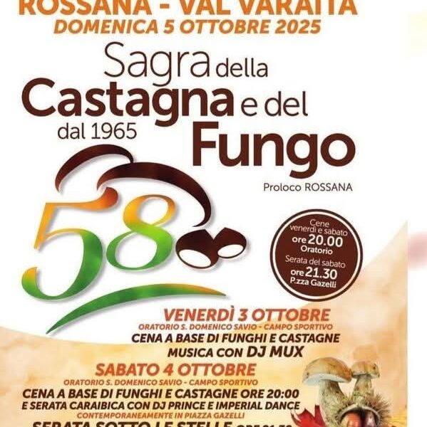 La Sagra della Castagna e del Fungo di Rossana unisce due eccellenze autunnali: castagne e funghi. Durante la manifestazione è possibile partecipare a degustazioni, mercati gastronomici e attività per famiglie, immergendosi nella cultura e nelle tradizioni della Valle Stura.