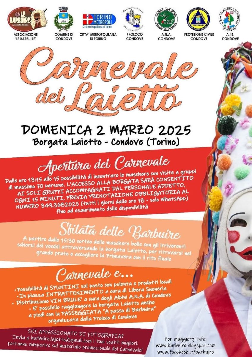 - Eventi Collaterali: saranno disponibili spuntini con polenta e prodotti locali, momenti di intrattenimento musicale a cura di Libera Suoneria, e la distribuzione di vin brulé a cura degli Alpini A.N.A. di Condove. Sarà inoltre possibile raggiungere la borgata Lajetto a piedi grazie alla passeggiata “A passo di Barbuiire” organizzata dalla Proloco di Condove.