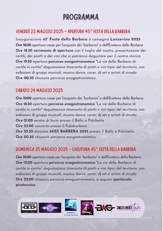 Ore 18.30 apertura percorso enogastronomico “Le vie della Barbera: di cortile in cortile” degustazione itinerante di piatti e vini tipici del territorio, con esibizioni di gruppi musicali, musica dance, cover, dj set e artisti di strada Ore 21.00 serata di liscio presso il Ballo a Palchetto Ore 23.00 concerto presso il Palabarbera