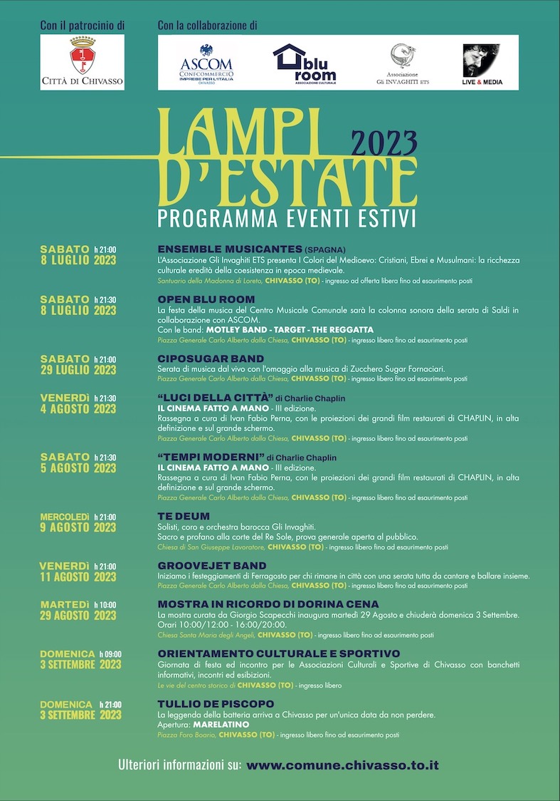 Si chiama “Lampi d’Estate” il cartellone di eventi estivi promossi a Chivasso, Comune Amis di Gite Fuori Porta in Piemonte, dall’Assessorato Comunale alla Cultura. Da sabato 8 luglio al prossimo 3 settembre, musica, arte, spettacoli e manifestazioni sportive si alterneranno in città con la collaborazione di Ascom Confcommercio, Blu Room, l’associazione Gli Invaghiti e Live & Media.