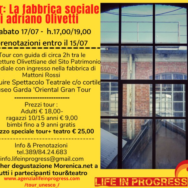 TOUR & TEATRO : SABATO 17/07 IVREA: LA FABBRICA SOCIALE DI ADRIANO OLIVETTI h.17,00-19,00 ca. Tour guidato di circa 2h tra le architetture Olivettiane di via Jervis Patrimonio dell'Unesco raccontando l'esperienza sociale e industriale delle Fabbrica Dell'Uomo. Un tour avvincente, in esterna con ingresso esclusivo nella fabbrica di mattoni rossi. A seguire H.21,30 per Morenica.net presso […]