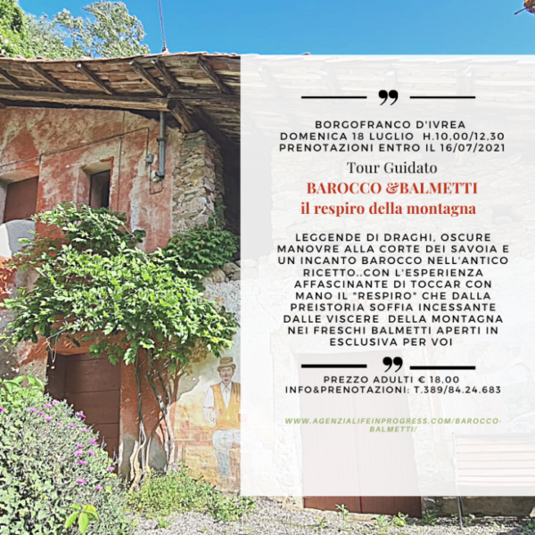 TOUR GUIDATO : DOMENICA 18/07 Barocco&Balmetti: IL RESPIRO DELLA MONTAGNA h.10,00-12,30 ca. Alla scoperta del piccolo borgo che non si fa mancare nulla: via francigena- ricetto medievale- Draghi che mangiano i bambini e un Palazzo Signorile nascosto con Splendidi affreschi barocchi che celano segreti di spie , intrighi e trame alla corte dei Marini-Savoia. Con […]