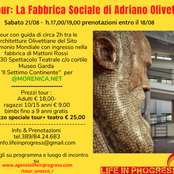TOUR & TEATRO : SABATO 21/08 IVREA: LA FABBRICA SOCIALE DI ADRIANO OLIVETTI h.17,00-19,00 ca. Tour guidato di circa 2h tra le architetture Olivettiane di via Jervis Patrimonio dell'Unesco raccontando l'esperienza sociale e industriale delle Fabbrica Dell'Uomo. Un tour avvincente, in esterna con ingresso esclusivo nella fabbrica di mattoni rossi. A seguire h.21,30 nel cortile del […]