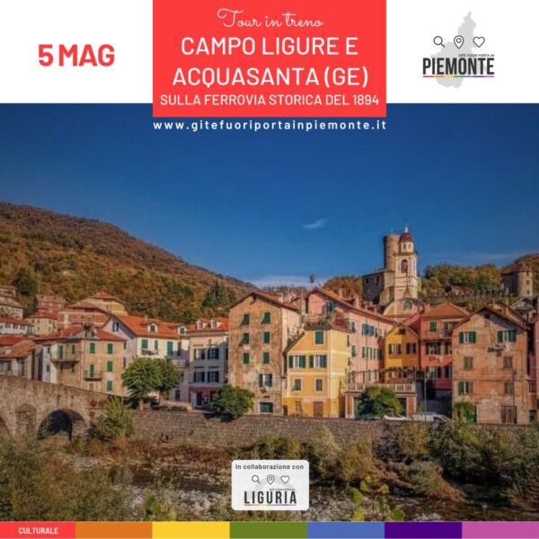 Domenica 5 Maggio 2024 (ADESIONI ENTRO IL 03/05/2024) Immergiti nell'incanto del tour in treno a Campo Ligure e alle Terme di Acquasanta (GE) lungo la storica ferrovia del 1894 "Acqui Terme-Genova Brignole". Esplora il fascino del Feudo Imperiale di Campo Ligure, tra le testimonianze della potente casata genovese Spinola e l'arte millenaria della filigrana, prima […]