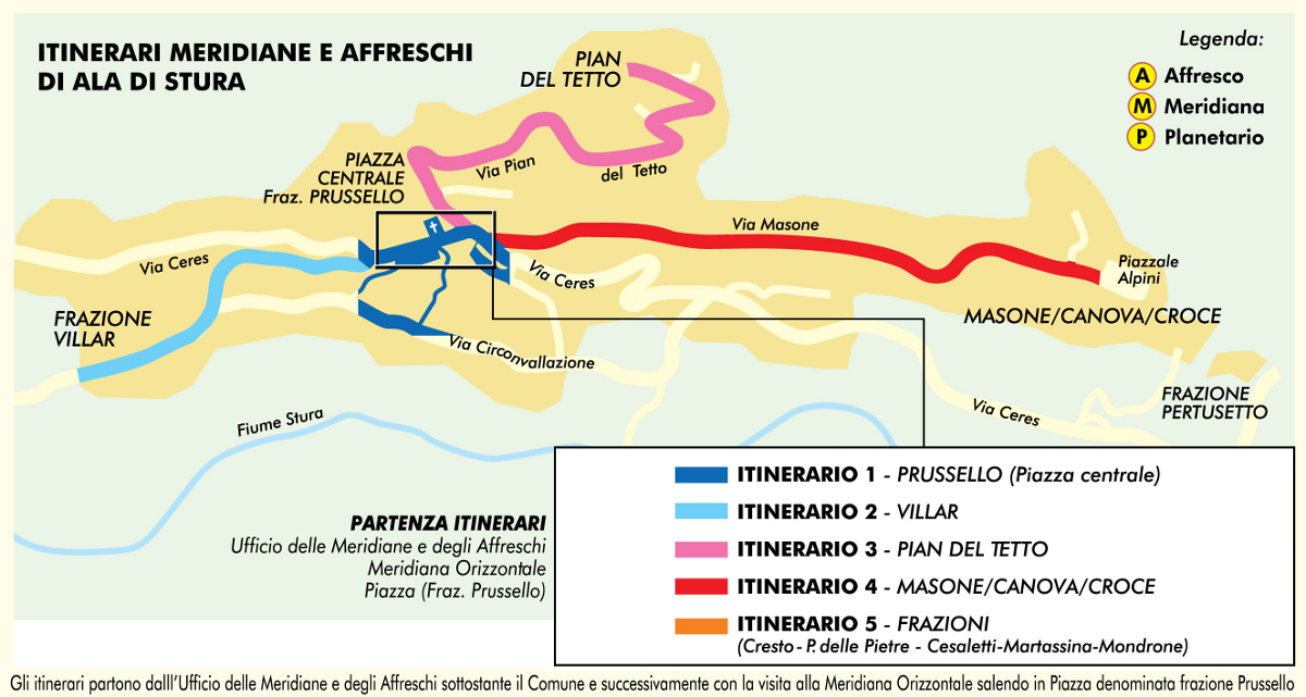 Per permettere ai turisti di visitare il territorio e scoprire gli orologi solari e gli affreschi, sono stati creati cinque diversi percorsi che attraversano le frazioni. Il punto di partenza di tutti gli itinerari è l’Ufficio delle Meridiane e degli Affreschi, dove si possono reperire informazioni dettagliate e materiale didattico utile per apprezzare al massimo queste opere d’arte.