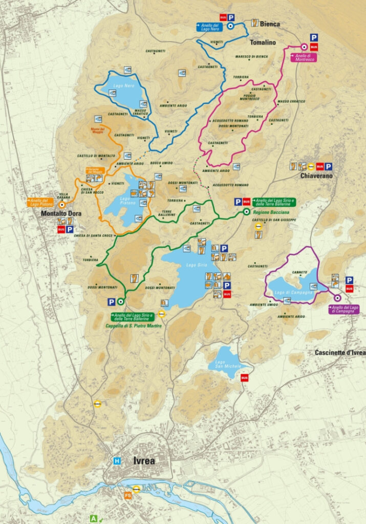 Di per sè l’anello dei cinque laghi non è un percorso unico, ma i vari anelli si intersecano fra di loro, rendendo possibile l’esplorazione dell’intero territorio, camminando piacevolmente su percorsi di trekking facili, ombreggiati, ottimi anche per le famiglie, che attraversano i boschi silenziosi dall’aria antica, selvatica e al contempo mite della zona di Ivrea e di tutti i suoi laghetti morenici.