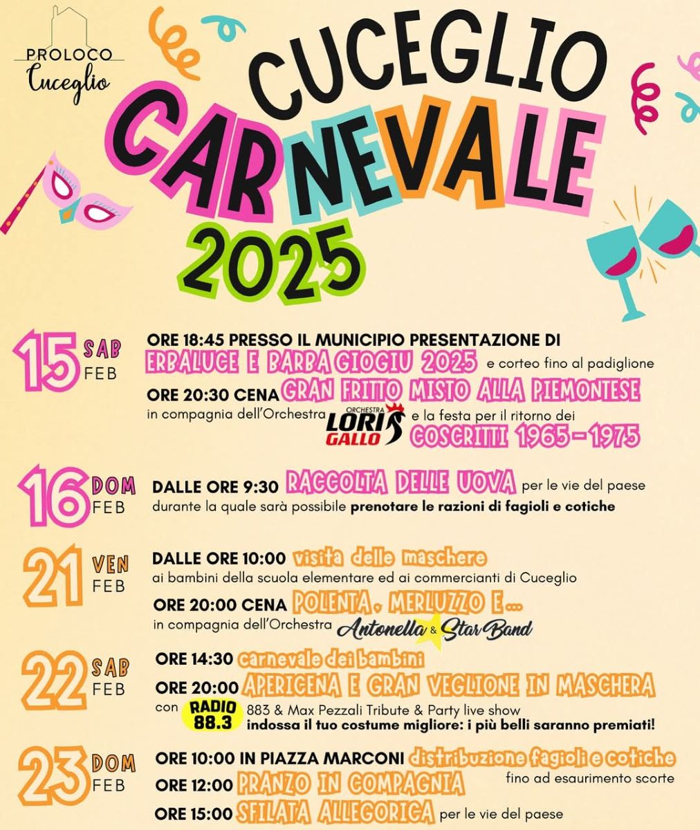 Sabato 15 febbraio, alle 18:45, presentazione delle maschere tradizionali Erbaluce e Barba Giogiu, seguita da una cena a base di fritto misto piemontese. Domenica 16 febbraio, dalle 9:30, raccolta delle uova per le vie del paese.