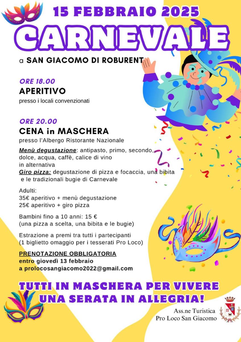 Sabato 15 febbraio, la Pro Loco organizza una serata di festeggiamenti con aperitivo alle 20:00 presso i locali convenzionati, seguito da una cena in maschera.