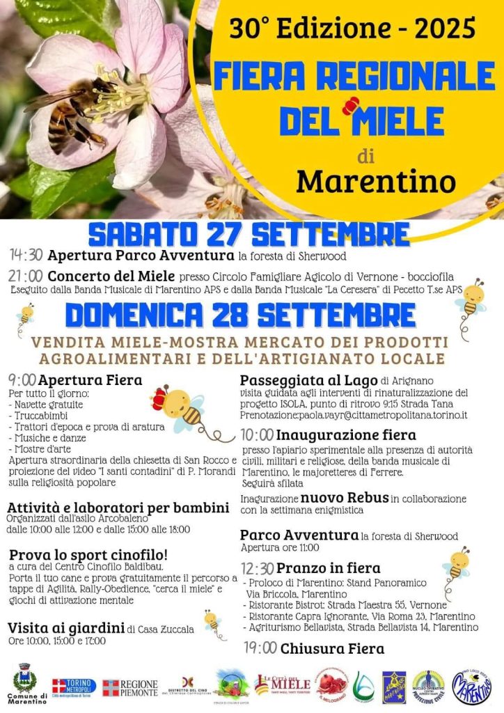 Domenica 28 settembre, il pittoresco borgo di Marentino, nel cuore delle colline torinesi, ospiterà la 30ª edizione della Fiera Regionale del Miele. Dalle 9:00 alle 19:00, il centro storico si trasformerà in un vivace mercato all’aperto, offrendo ai visitatori un’esperienza unica all’insegna della natura, della tradizione e della dolcezza del miele piemontese.