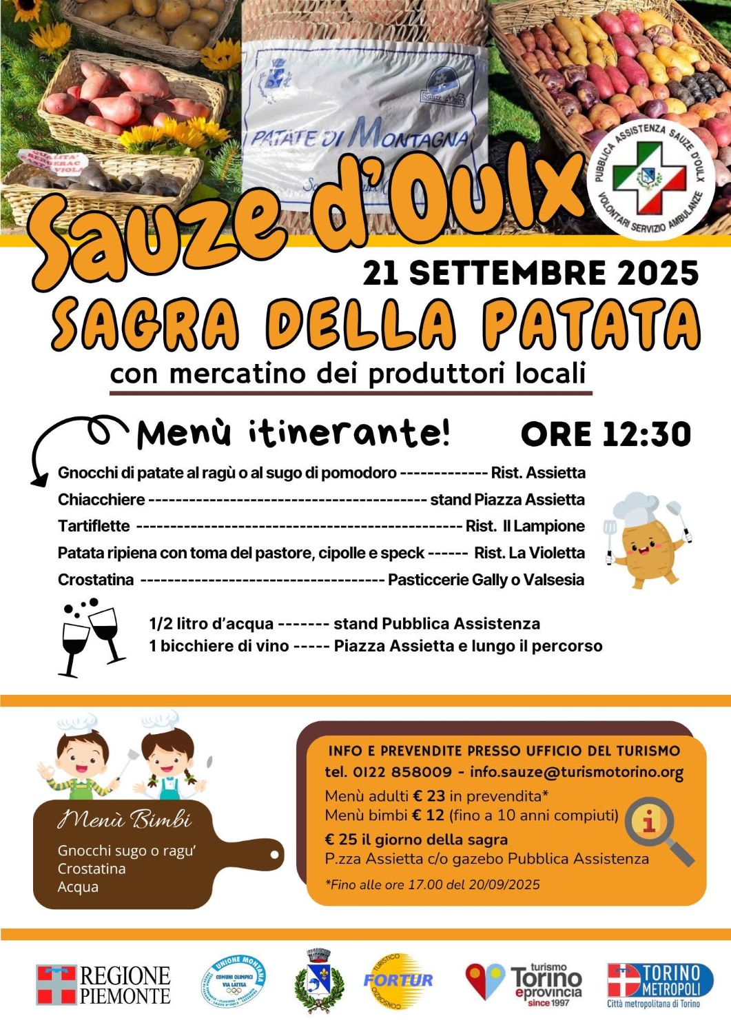 Menù itinerante: I ristoranti aderenti proporranno piatti tipici a base di patate, come gnocchi al ragù, patate ripiene con toma e speck, e tartiflette. Il menù adulti è disponibile a €25,00 (€23,00 in prevendita presso l’Ufficio del Turismo di Sauze d’Oulx fino alle ore 17:00 del 20 settembre).