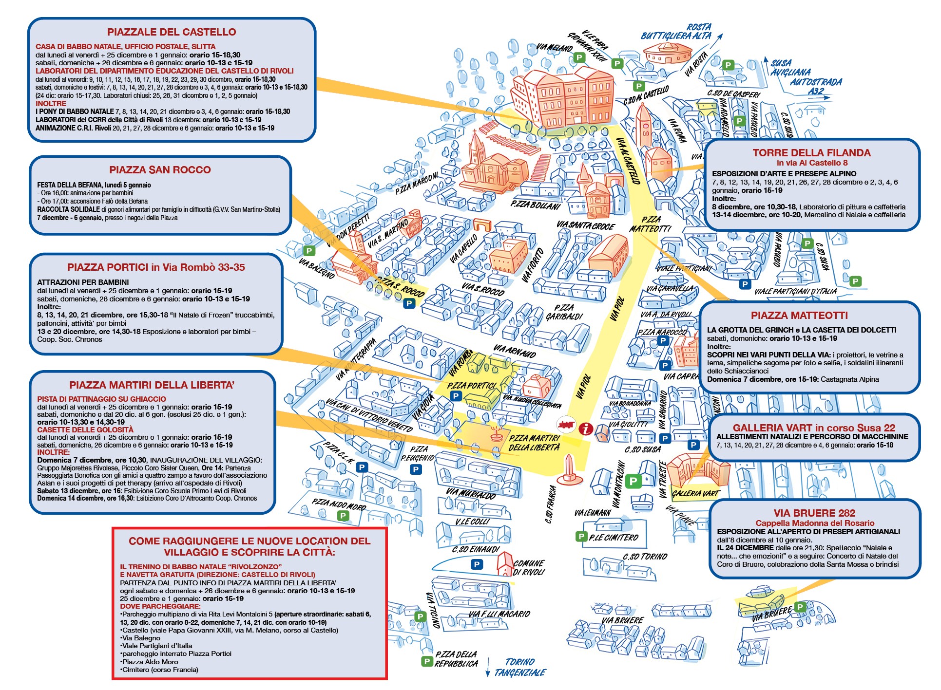 Tanti i luoghi coinvolti dalla magia delle feste per creare un percorso ricco di meraviglia e scoperta. Dal cuore del centro storico al suggestivo piazzale Mafalda di Savoia, ai piedi del maestoso Castello di Rivoli, partendo da piazza Martiri della Libertà, passando per via F.lli Piol, piazza Portici, piazza Matteotti, la Torre della Filanda, raggiungendo anche la Galleria Vart e via Bruere. Ogni angolo sarà vestito a festa per accogliere visitatori di ogni età!