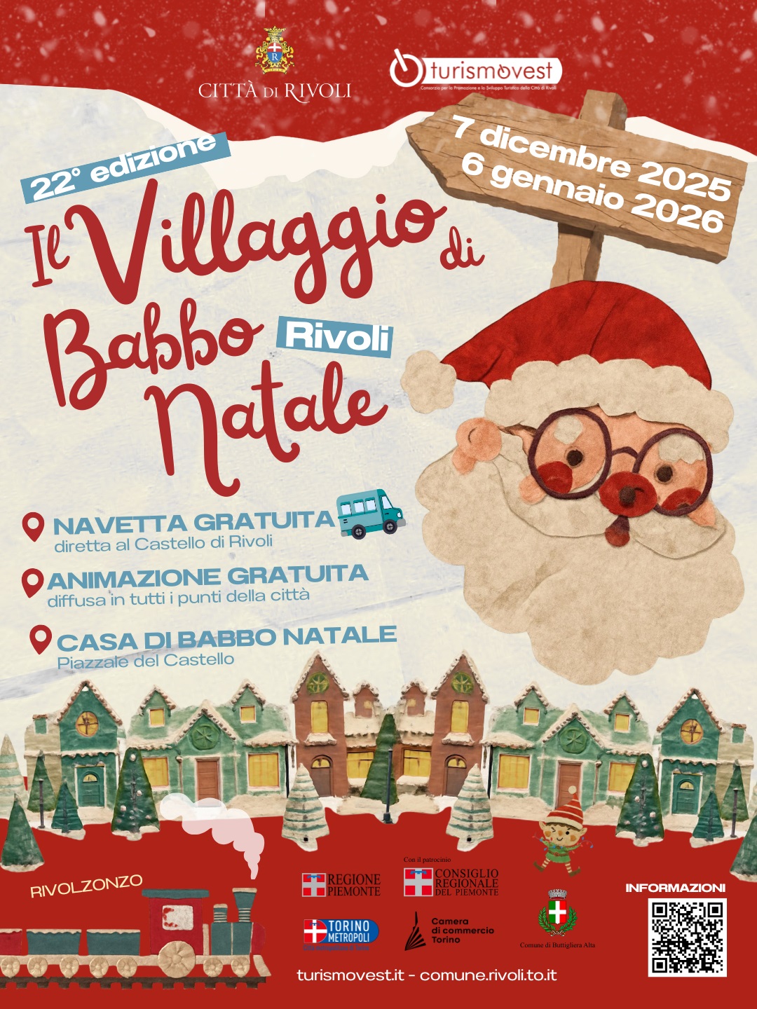 Per informazioni: 011/9561043 (da lunedì al venerdì in orario 9-12,30), info@turismovest.it. Oppure visitare il sito www.turismovest.it, Facebook Il Villaggio di Babbo Natale.