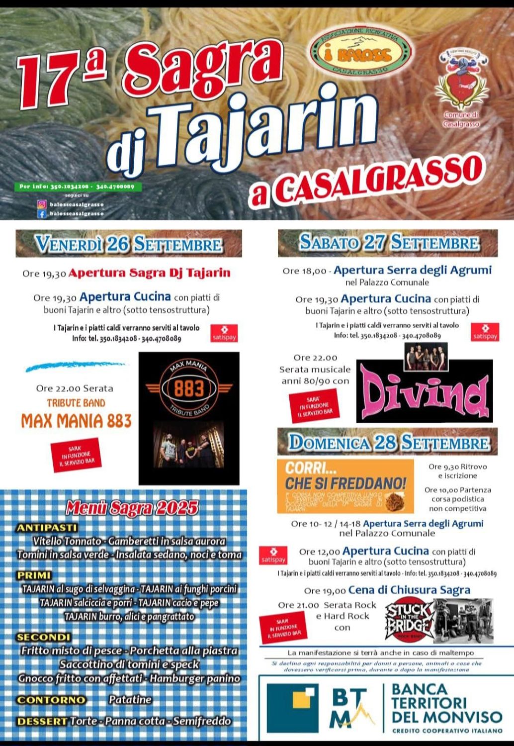 Dal 26 al 28 settembre 2025, il Comune di Casalgrasso ospita la 17ª edizione della Sagra del Tajarin, un appuntamento ormai consolidato per gli amanti della cucina piemontese, organizzato dall’associazione I Baloss in collaborazione con il Comune di Casalgrasso e con il sostegno della Banca Btm – Banca Territori del Monviso.